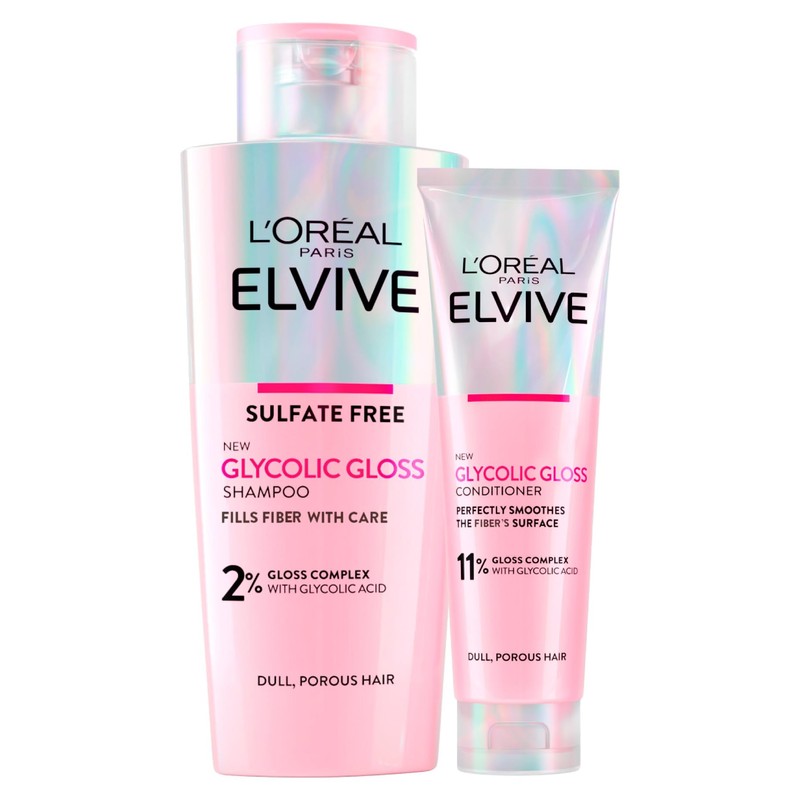 L'Oréal Paris Elvive Glycolic Gloss 200 ml Shampoo + 150 ml Conditioner with Glycolic Acid for Porous and Dull Hair - 2 Bottles