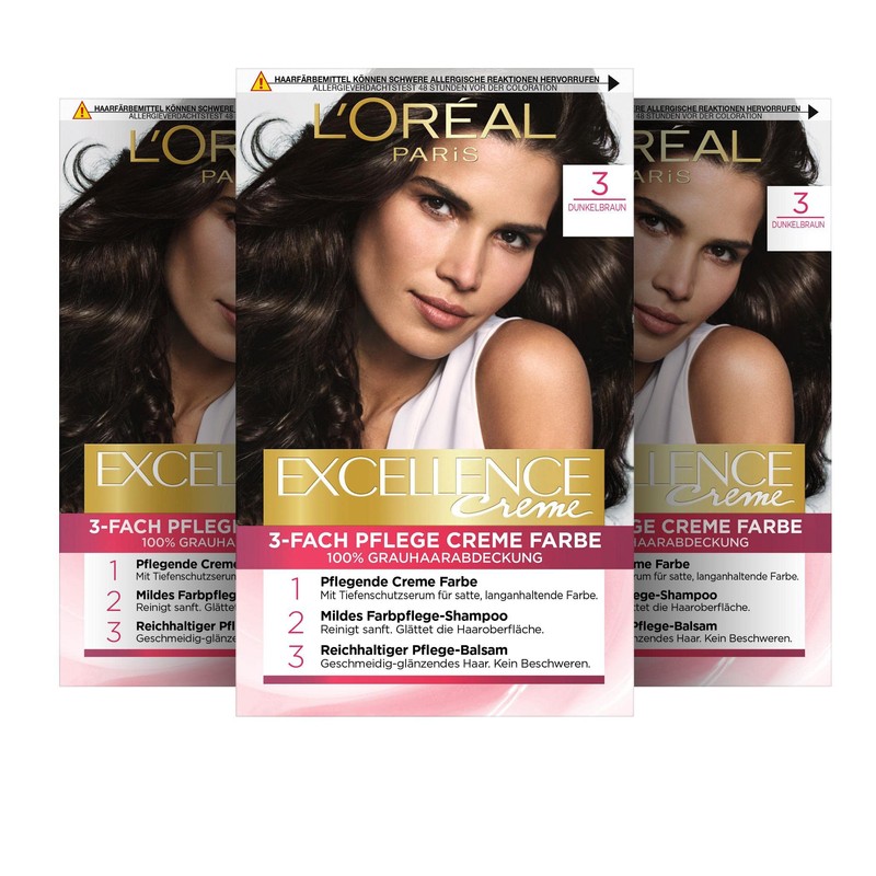 - Box contents: 3x L'Oréal Paris Creme Excellence permanent hair colour, colour: 3 dark brown, contents: 1x colour cream, 1x colour developer, 1x hair care shampoo, 1x conditioner, 1 pair of disposable gloves