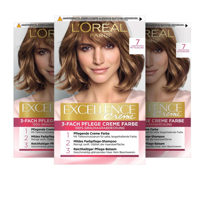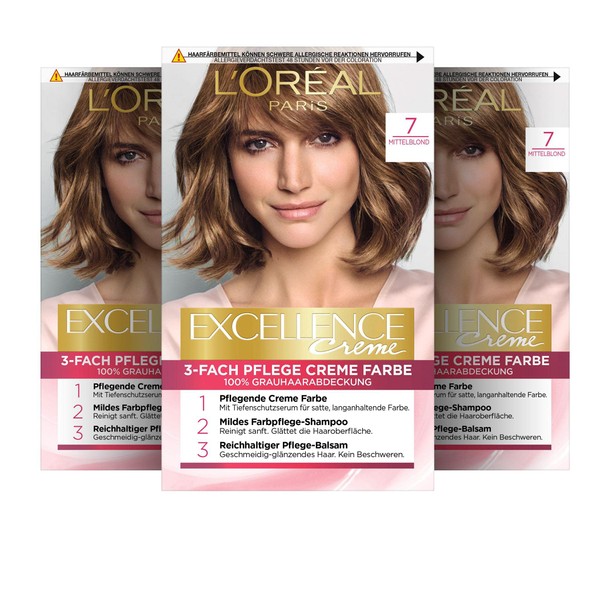 - Box contents: 3x L'Oréal Paris Creme Excellence permanent hair colour, colour: 7 medium blonde, contents: 1x colour cream, 1x colour developer, 1x hair care shampoo, 1x conditioner, 1 pair of disposable gloves