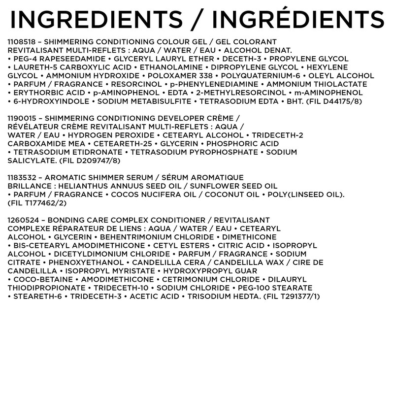 - Content : 1x shimmering conditioning color crème, shimmering conditioning developer crème, Bonding Complex complex conditioner, colourist gloves, insert.