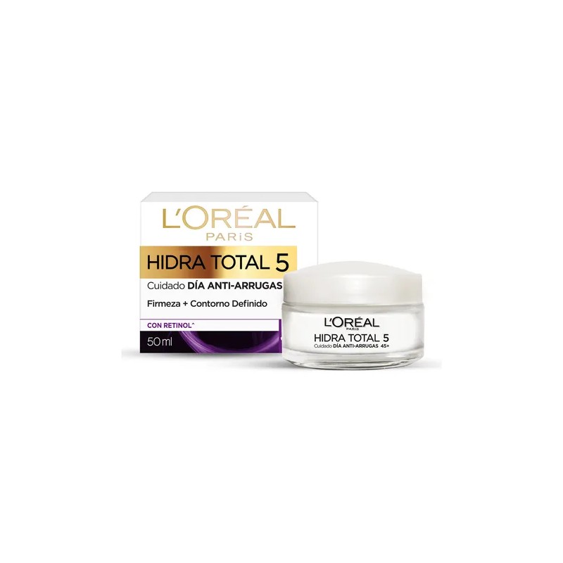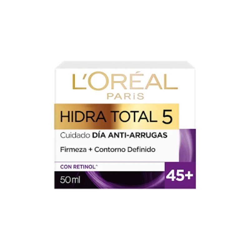 Crema Antiarrugas L'oréal Paris Hidratotal5 Con Retinol, 50ml. Esta crema facial está diseñada para personas de más de 45 años y contiene retinol, un ingrediente conocido por su eficacia en la mejora de la textura y elasticidad de la piel.