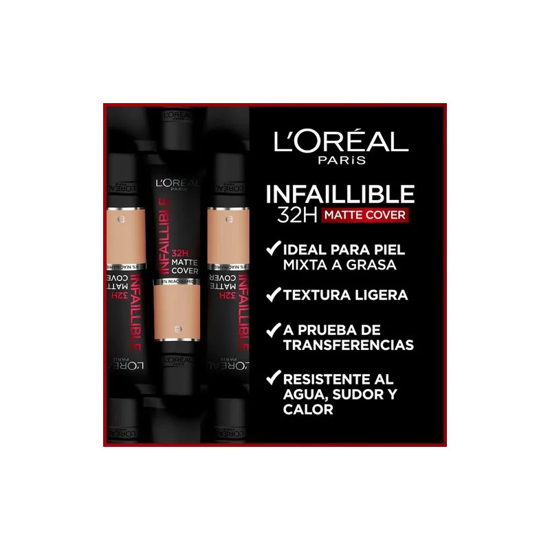 Disfruta de una larga duración de 32 horas de maquillaje perfecto y una alta cobertura con acabado mate que controla el brillo durante todo el día. Además, es a prueba de agua y cuenta con Factor de Protección Solar (FPS) 25, brindando protección contra los rayos UV. Es apta para piel mixta a grasa, no comedogénica, libre de gluten y parabenos, y libre de crueldad animal. ¡Luce una piel impecable, mate y visiblemente mejorada con L'Oréal Paris Infaillible Matte Cover! 💖☀️