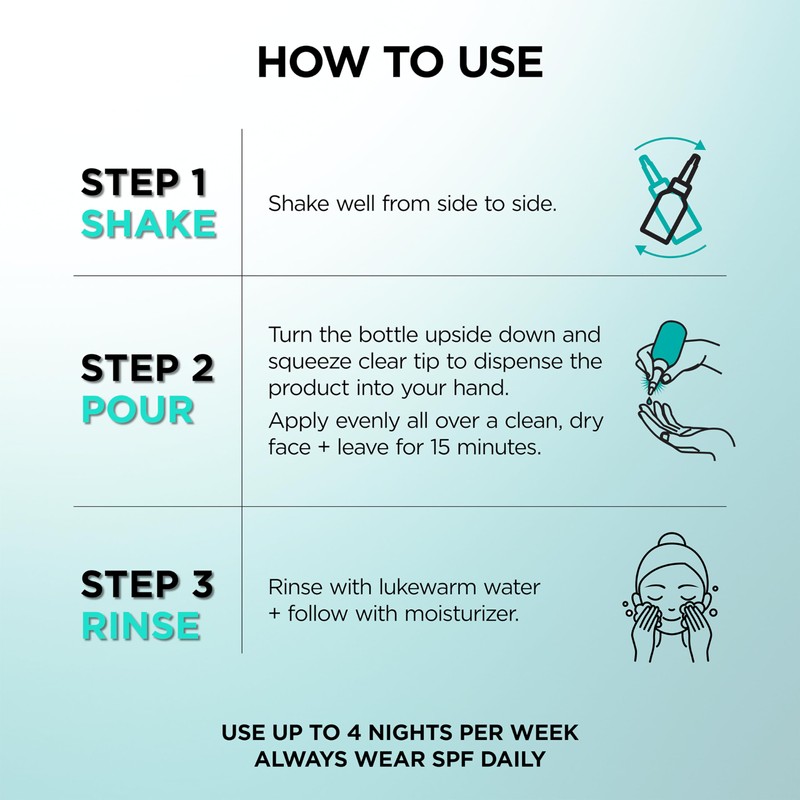 - For Best Use: Shake from side to side. Turn bottle upside down, squeeze clear tip to dispense product. Apply all over a clean, dry face & leave for 15mins. Rinse with lukewarm water. Follow with moisturizer. Apply a minimum SPF 30 sunscreen every day