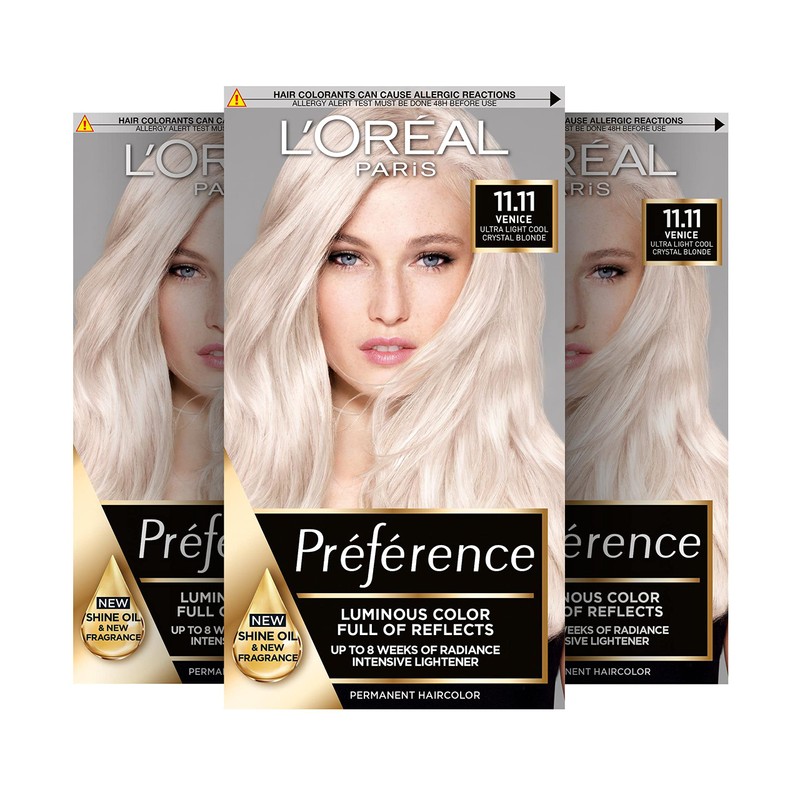 - Box contents: 3x L'Oréal Paris Préférence permanent hair colour, colour: 11.11 Island (ultra-light cool crystal blonde), contents: hair dye set with colour gel, developer cream, oil drops, conditioner, 1 pair of disposable gloves