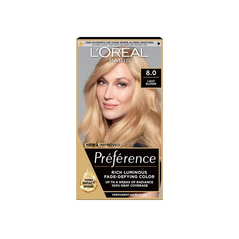 - Contents: 1x L'Oréal Paris Preference permanent hair colour in 08 California, Each box includes: 1x caring colourant crème, 1x developer crème, 1x conditioner, 1x pair of protective gloves