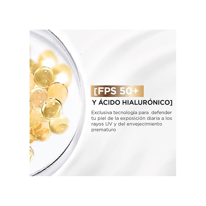 Cuidado diario de L'Oréal Paris con una exclusiva tecnología combinando muy alta protección FPS 50+ y ácido hialurónico puro para defender tu piel de la exposición diaria a los rayos UVB y UVA y del envejecimiento prematuro: líneas de expresión, arrugas, manchas*. *Debidas al sol.