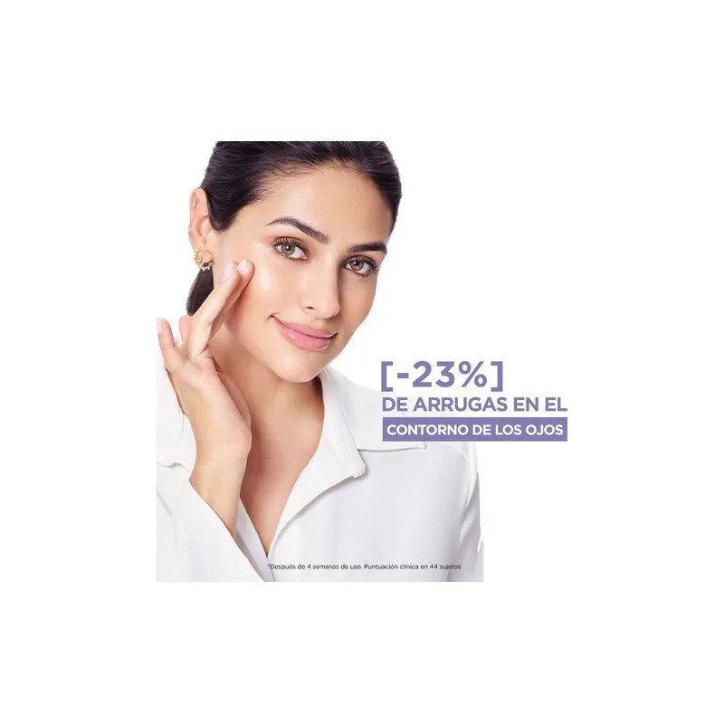 Crema para ojos Revitalift de L'Oréal Paris, diseñada para el cuidado intensivo del contorno de los ojos. Enriquecida con Ácido Hialurónico, ayuda a rellenar las líneas de expresión y cuenta con protección solar FPS 20. Ideal para mujeres a partir de los 30 años y probada por dermatólogos.