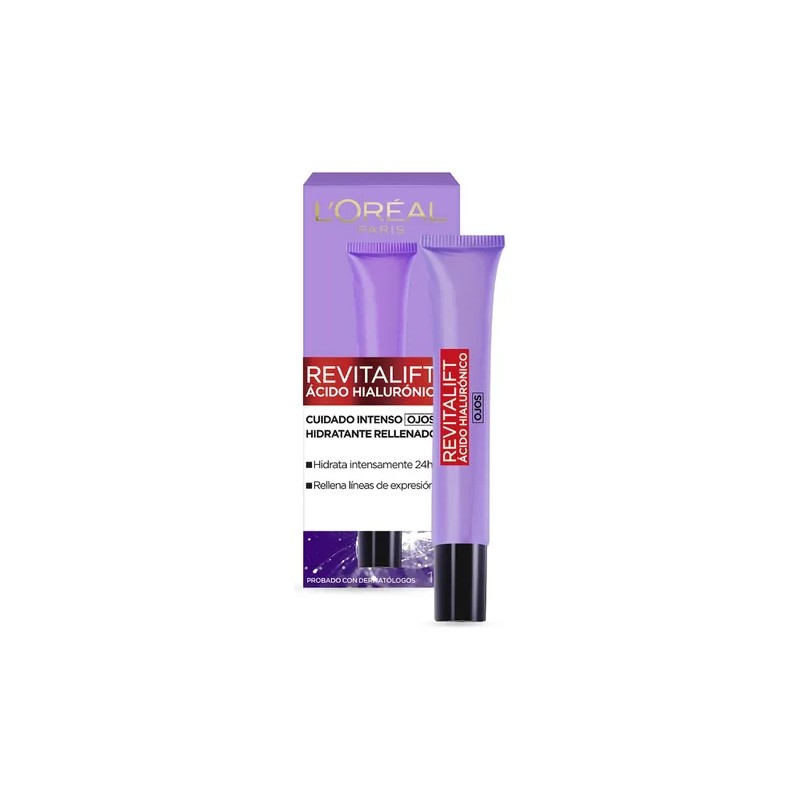 Crema para ojos Revitalift de L'Oréal Paris, diseñada para el cuidado intensivo del contorno de los ojos. Enriquecida con Ácido Hialurónico, ayuda a rellenar las líneas de expresión y cuenta con protección solar FPS 20. Ideal para mujeres a partir de los 30 años y probada por dermatólogos.