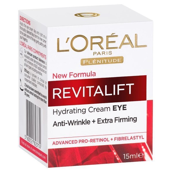 L'Oréal Paris® Revitalift anti-wrinkle + extra-firming Eye Cream has been developed to hydrate and tone the eye contour area and visibly reduce wrinkles and crow's feet. The formula is enriched with Advanced Pro-RetinolTM, a powerful dermatologist-inspired anti-wrinkle ingredient that helps smooth the skin surface. It is also enriched with Fibrelastyl, a firming complex which helps reinforce skin elasticity for firmer skin.Size: 15ml