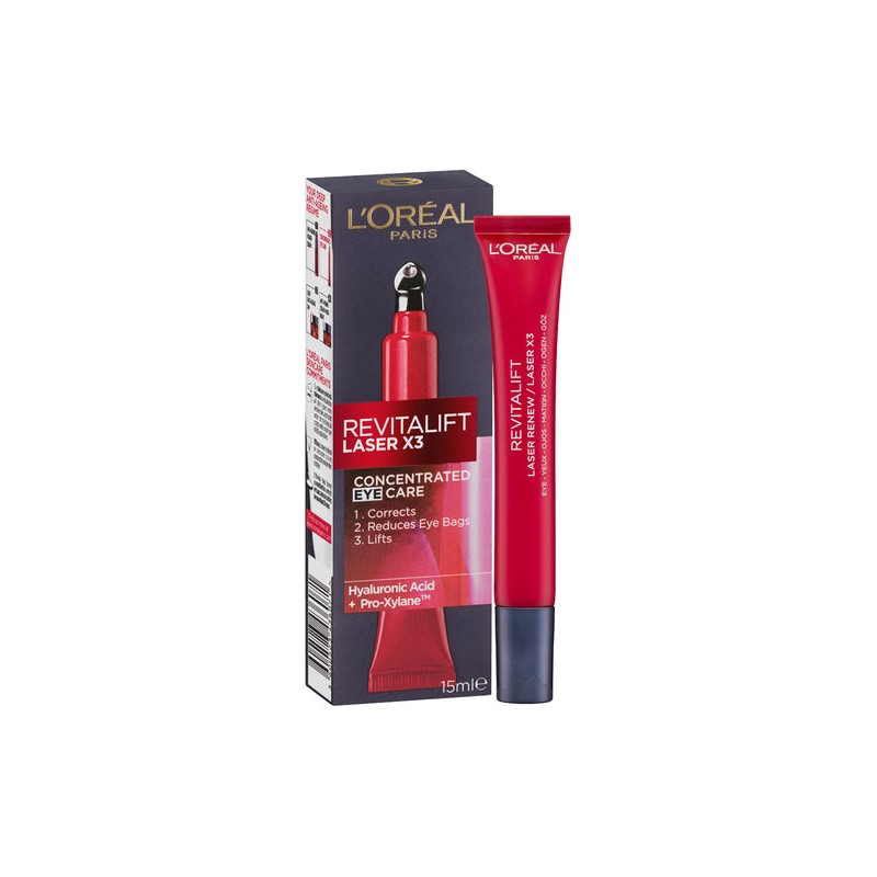 For the first time, L'Oréal Paris has developed an anti-ageing skincare product to challenge a laser session. Active ingredients Pro-Xylane (concentrated to 3%), Fragmented Hyaluronic Acid and Caffeine offer anti-ageing in-depth. The fluid texture glides on easily with a metal applicator for an instant cooling effect. Providing an anti-ageing eye treatment; Revitalift Laser X3 Eye Cream corrects wrinkles, visibly reduces under-eye bags, re-firms the skin and stimulates microcirculation. 1. CORRECTS WRINKLES: enriched with fragmented Hyaluronic Acid, to repair and correct the appearance of wrinkles. 2. REDUCES EYE BAGS: enriched with Caffeine, it helps stimulate microcirculation* to deflate eye bags. The innovative metal applicator provides an additional cooling e ect. 3. FIRMS: enriched with Pro-Xylane™, this strengthens the support fibres firming and plumping the skin. Dermatologically tested. Suitable for all skin types, including sensitive skin.Size: 15ml