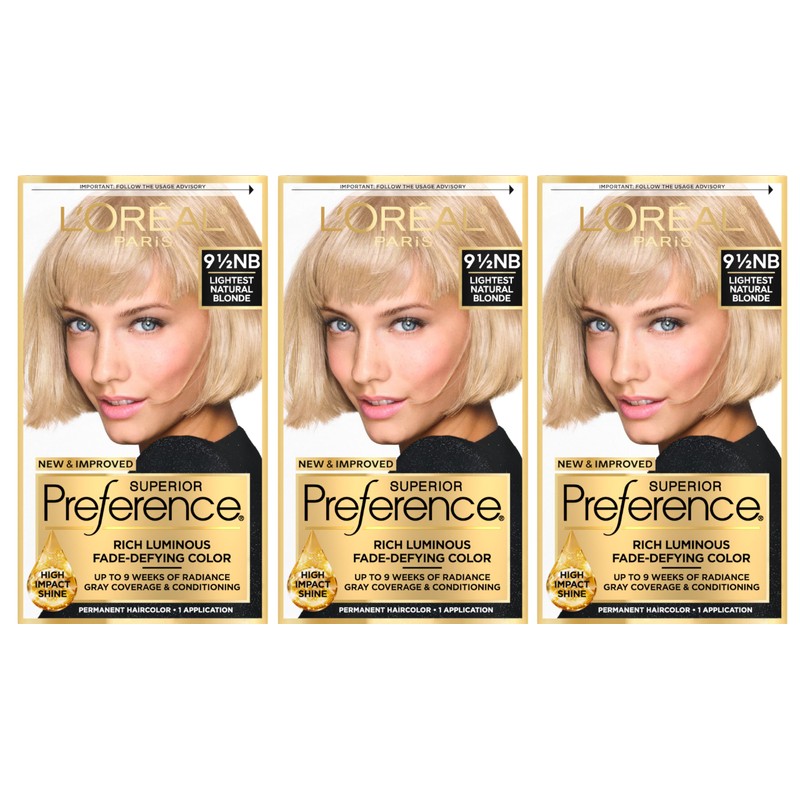 L'Oreal Paris Superior Preference Luminous Fade-Defying Permanent Hair Color, Hair Dye For Up to 9 Weeks of Radiance, Lightest Natural Blonde 9.5NB, 1 Hair Dye Kit (Pack of 3)