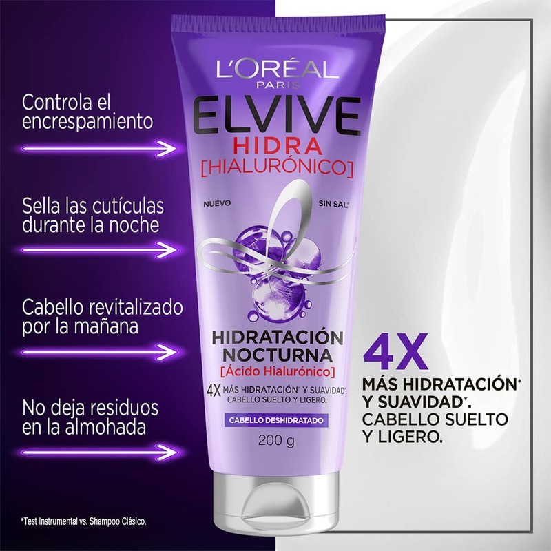 L'Oréal Paris Tratamiento nocturno para el pelo con Ácido Hialurónico Elvive Hidra Hialurónico hidratación intensa para cabello deshidratado hasta 72 horas 370 ml