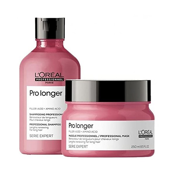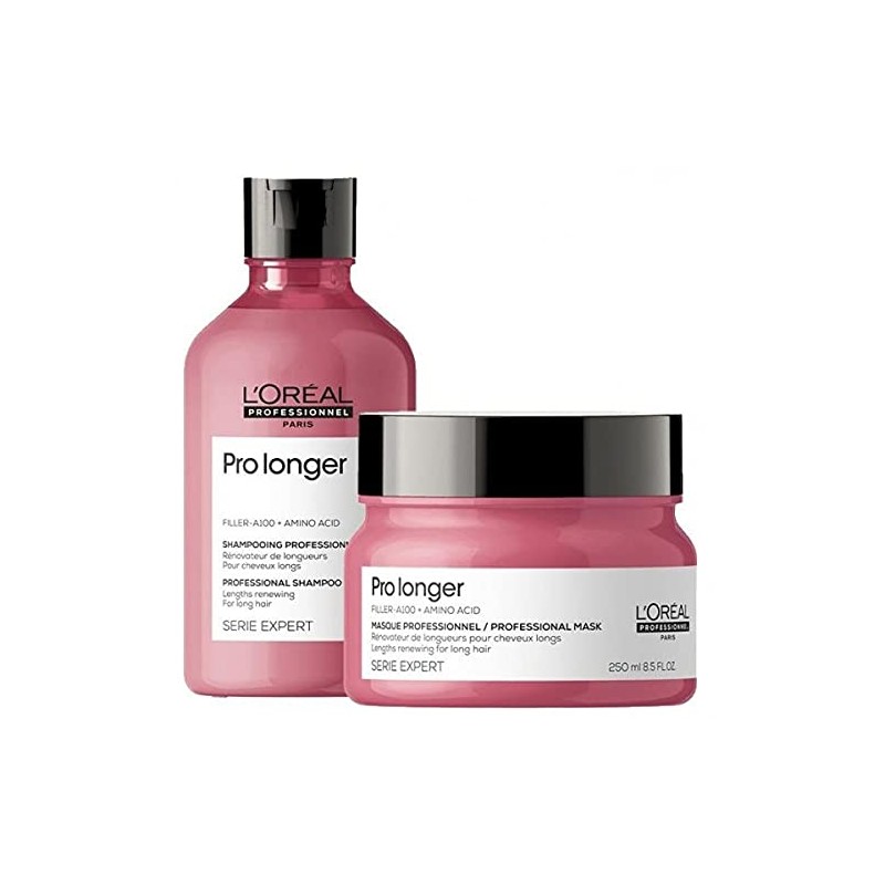 L'Oréal Professionnel Paris Series Expert Pro Longer Shampoo 300 ml Mask 250 ml Length Renewal Shampoo Suitable for all hair types Performances: Gives the hair shine, ideal balance between lightness and cosmetic effect. Use method: clean the hair with shampoo. pro longer. Before applying the filling lampoule. Length renewal mask, which must be replaced as a second step when the filling lamp is not used. Performances: Significantly reduction of split ends. Application method: After shampoo, leave for 3/5 minutes