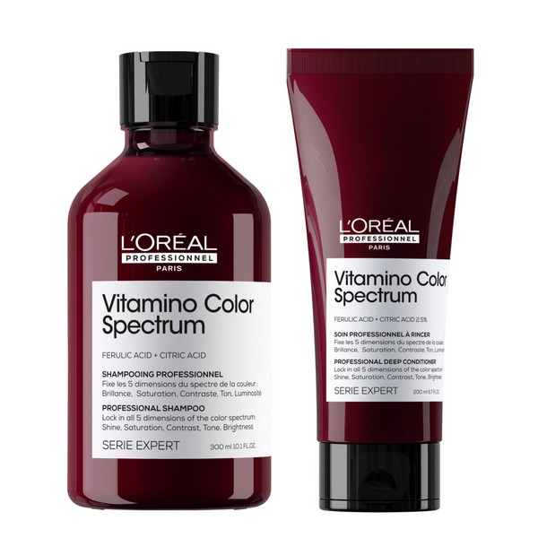The L'Oreal Professionnel Color Spectrum Shampoo and Conditioner Duo Bundle is designed to enhance and protect your hair color. This duo bundle from L'Oreal Professionnel includes a specially formulated shampoo and conditioner that work together to maintain vibrant hair color while providing nourishment and protection. The Vitamino Color Spectrum Shampoo gently cleanses your hair, removing impurities without stripping away color, while the Vitamino Color Spectrum Conditioner deeply conditions and detangles, leaving your hair smooth and shiny. Perfect for color-treated hair, this bundle ensures your hair looks salon-fresh every day. What is included in L'Oreal Professionnel Color Spectrum Shampoo and Conditioner Duo Bundle? • Vitamino Color Spectrum Shampoo 300ml • Vitamino Color Spectrum Conditioner 200ml What are the features and benefits of L'Oreal Professionnel Color Spectrum Shampoo and Conditioner Duo Bundle? Vitamino Color Spectrum Shampoo: This shampoo is enriched with antioxidants and UV filters to protect your hair color from fading. It gently cleanses your hair, removing impurities while preserving the vibrancy of your color-treated hair. Vitamino Color Spectrum Conditioner: This conditioner provides intense nourishment and detangling benefits, leaving your hair smooth, shiny, and easy to manage. It helps to lock in color and maintain the health of your hair. Who is L'Oreal Professionnel Color Spectrum Shampoo and Conditioner Duo Bundle for? This product is for anyone with color-treated hair looking to maintain vibrant color and healthy, nourished hair.