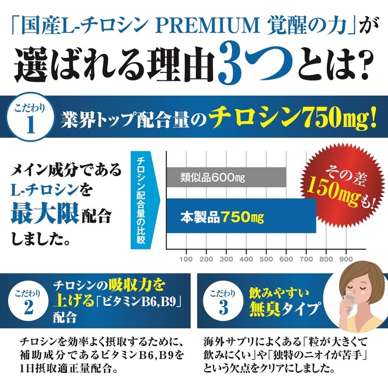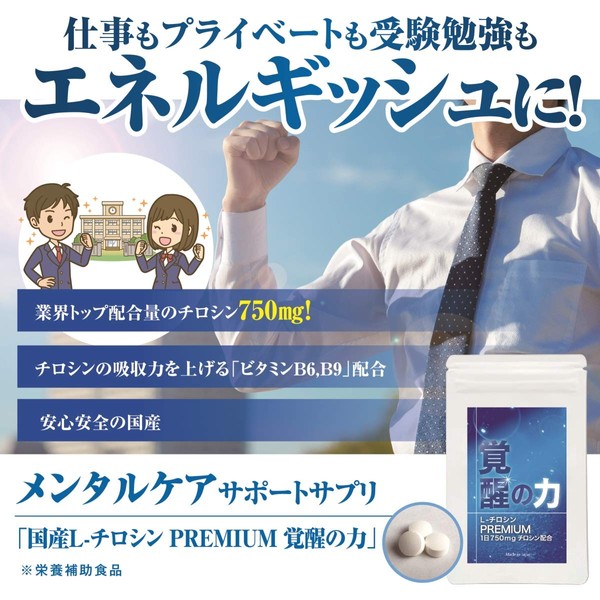 国産L-チロシン サプリメント 覚醒の力PREMIUM 1粒250mg 1日摂取量750mg 1ヶ月22500mg チロシン 配合 サプリ 90粒 1ヶ月分 ビタミンB6 葉酸配合