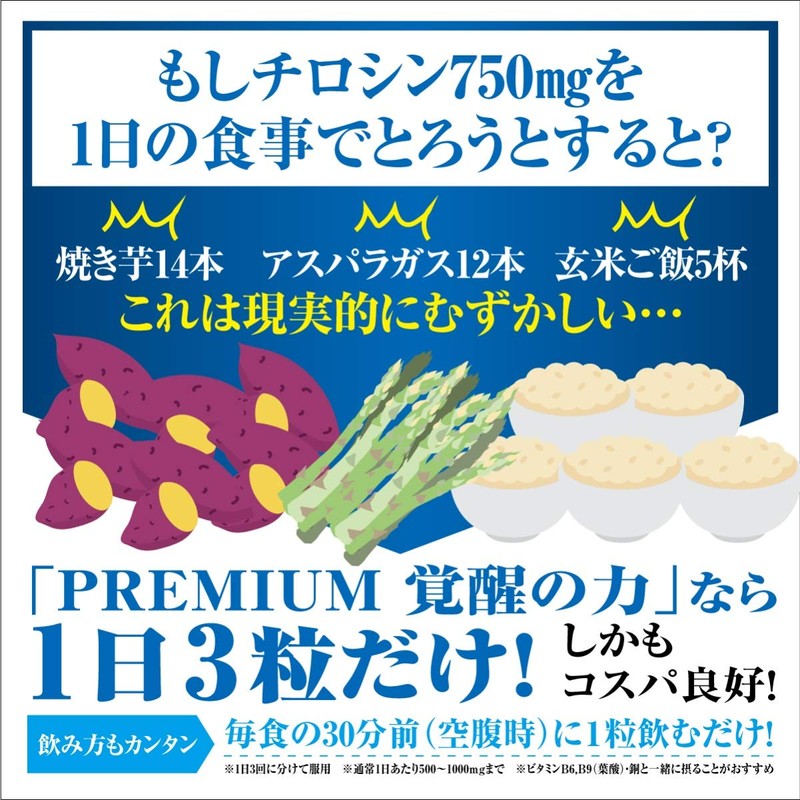 - 1日3粒に含まれるチロシン量は焼き芋14本、玄米ご飯5杯分に相当するチロシン750mgを贅沢に配合しております。毎食の30分前(空腹時)にチロシン サプリを1粒ずつ(1日3粒)飲むことをオススメします。