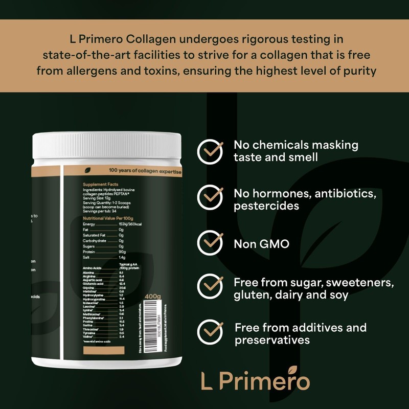 - OPTIMAL ABSORPTION: L Primero collagen undergoes market-leading extraction & hydrolysis processes to produce smaller bioactive peptide molecules that are more easily absorbed by the body. The high amino acid content, combined with our leading processes results in a high-performing, highly absorbable collagen.