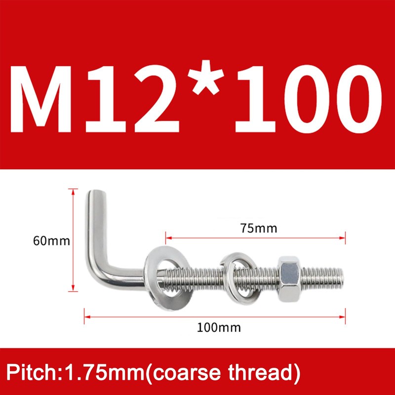 L-Shaped Threaded Bolt Kits, 304 Stainless Steel, Foundation Anchor Bolts, Square Screws, Hanging Hooks, M12 x 100mm, 2 Pieces