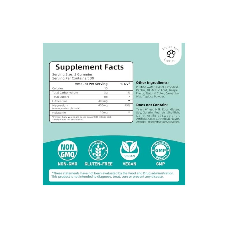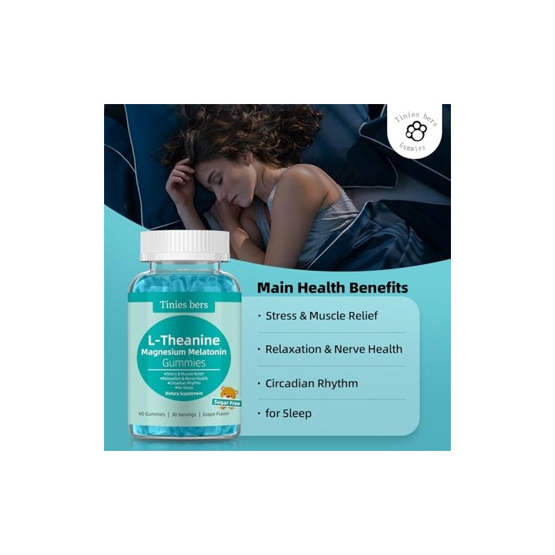 - L-Theanine Gummies: Tinies bers theanine gummies contain L-Theanine 400mg, Magnesium Glycinate 400mg, Melatonin 10mg per serving, promoting GABA production naturally through theanine and magnesium, rather than directly adding GABA. In addition, Tinies bers add melatonin in these gummies!