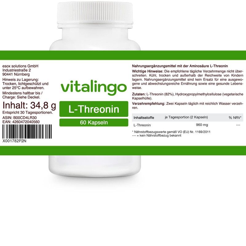 • Contents: 60 L-threonine capsules – each capsule 480 mg L-threonine in a capsule shell made of 100 mg hydroxypropylmethylcellulose (vegetarian capsule shell)