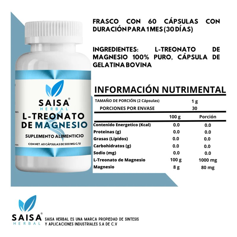 L-treonato De Magnesio Treonato de Magnesio Suplemento Alimenticio 100 Puro Saisa Herbal 60 Cpsulas Saisa Alta Absorcin Reduccion de estrs,...