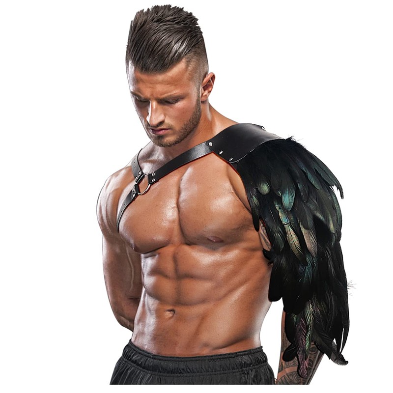 Upgrade your costume game with our Punk Feather Harness PU Leather Shoulder Straps.