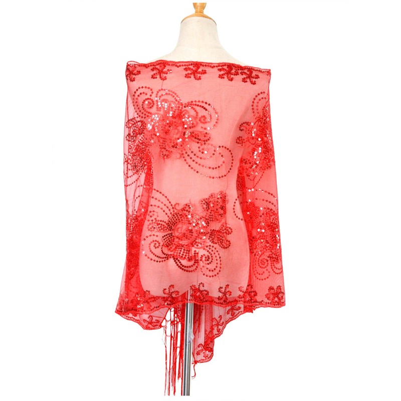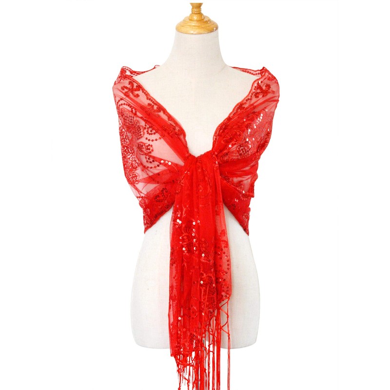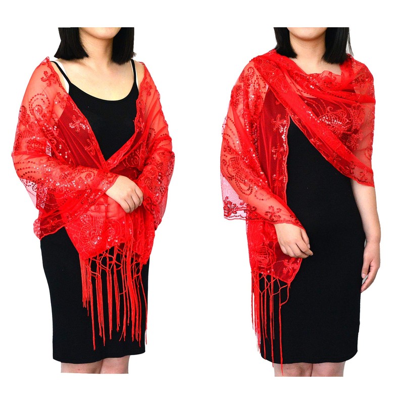 - Size: 22.8-63in, Fringe 7.0in. The dressy shawls and wraps for evening wear is super soft, comfortable and lightweight. This see-through lace Sequin shawl is a gorgeous accessory for spring, summer, winter and fall from day to night.