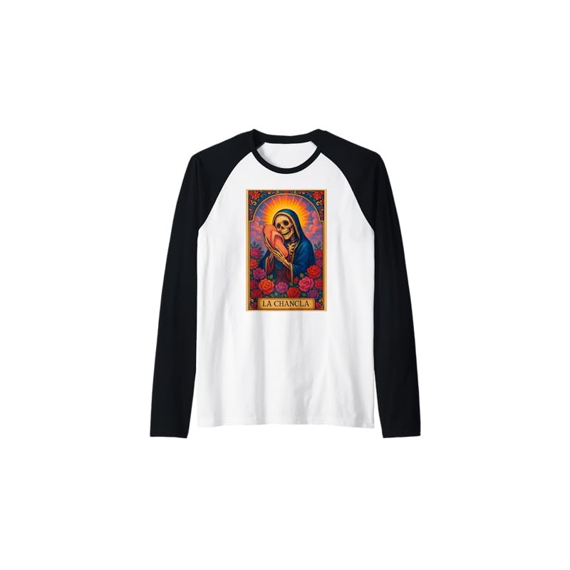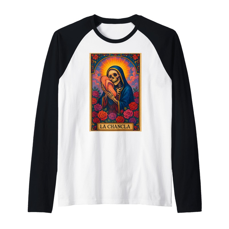 - A Día de los Muertos skeleton grips the chancla like divine power surrounded by sunburst, roses, and florals, this vintage Latino humor honors every mom, abuela, or sister who mastered the flip-flop and left a mark on family culture with fierce cariño.