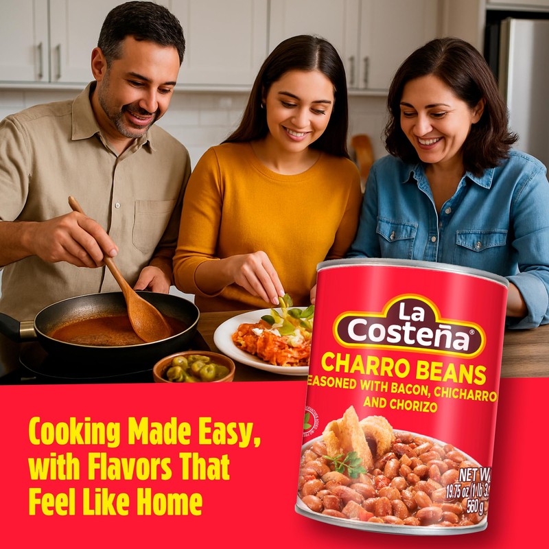La Costeña Charro Beans - Ready-to-Eat Canned Pinto Beans with Chorizo, Bacon & Chicharrones - Mexican Food, Tex Mex, Chili Ingredients, Bean Dip, Bean Burger & Burrito - 19.75oz, 12 Pack Canned Food