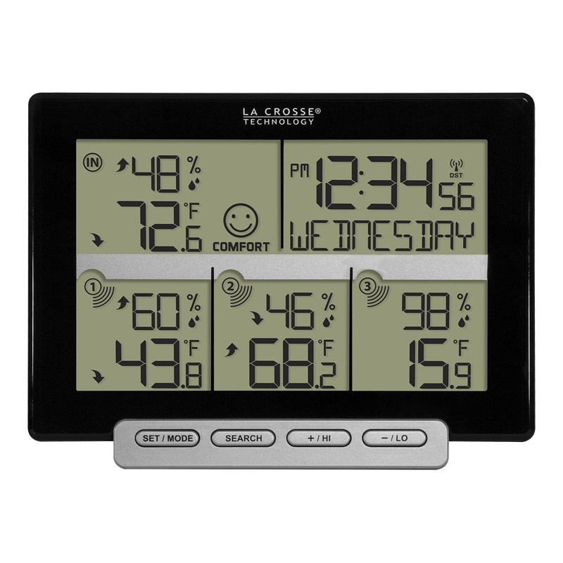 - Includes 3 wireless transmitting temperature and humidity sensors (F/C) with trend arrows