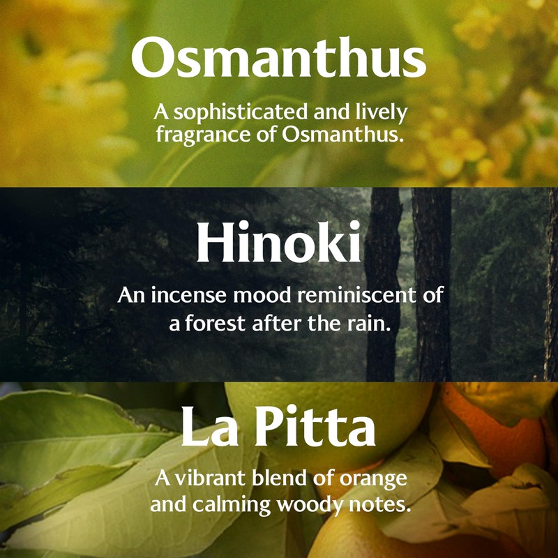 - 🌲 𝙏𝙃𝙍𝙀𝙀 𝘾𝘼𝙋𝙏𝙄𝙑𝘼𝙏𝙄𝙉𝙂 𝙁𝙍𝘼𝙂𝙍𝘼𝙉𝘾𝙀𝙎 𝙁𝙊𝙍 𝙀𝙑𝙀𝙍𝙔 𝙈𝙊𝙊𝘿 – Indulge in a scent journey with three unique fragrances. Hinoki evokes a misty forest after rain, blending bergamot, citrus, sage, incense, and musk for a calming, woody aroma. Osmanthus is a sophisticated floral-fruity blend with blackcurrant, grapefruit, jasmine, rose, and sandalwood, offering an uplifting touch. La Pitta combines orange, mandarin, coconut, jasmine, eucalyptus, and vanilla, balancing bright citrus with warm, grounding wood notes.