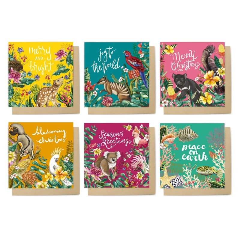 6 designed folded cards per set – includes envelopes in an illustrated cardboard box. Each card: 14cm x 14cm.