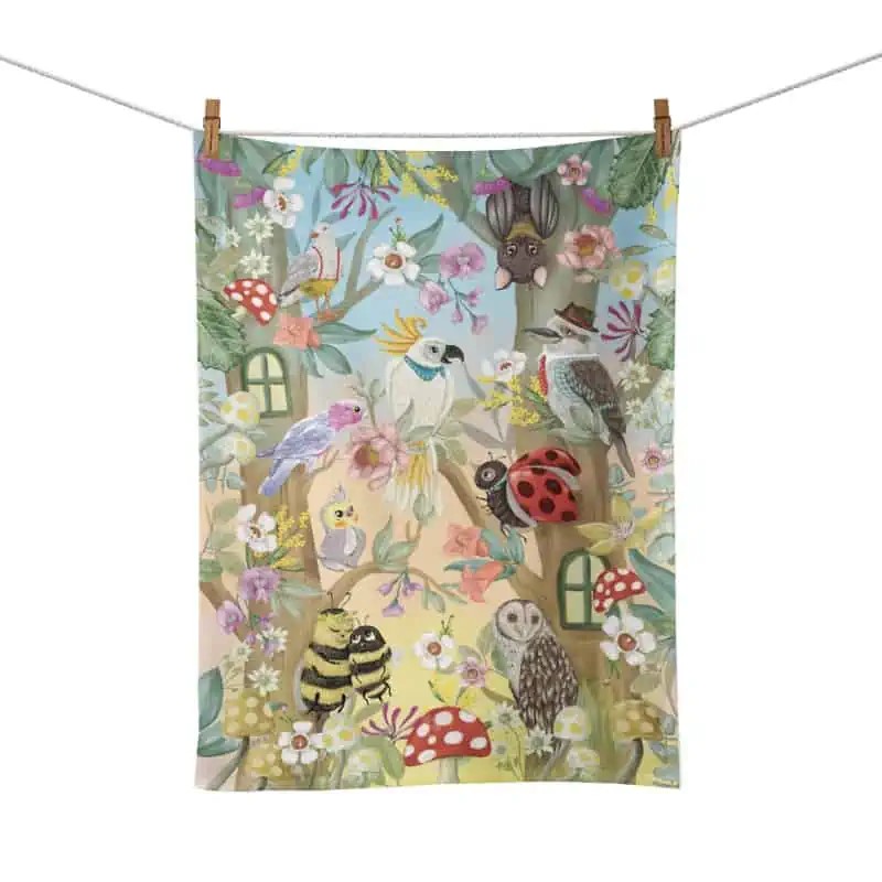 This tea towel is designed and screen printed onto a linen and cotton blend, making it durable and highly absorbent. It features bird friends of all kinds, including Cockatoos, Kookaburras, Owls, and insects – lots of animals to choose from! The tea towel will bring you good times whenever you need them