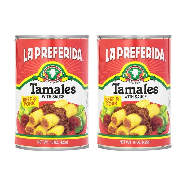 La Preferida Beef & Pork Tamales Hearty Mexican Canned Tamales in Red Sauce 15oz. (Pack of 2)