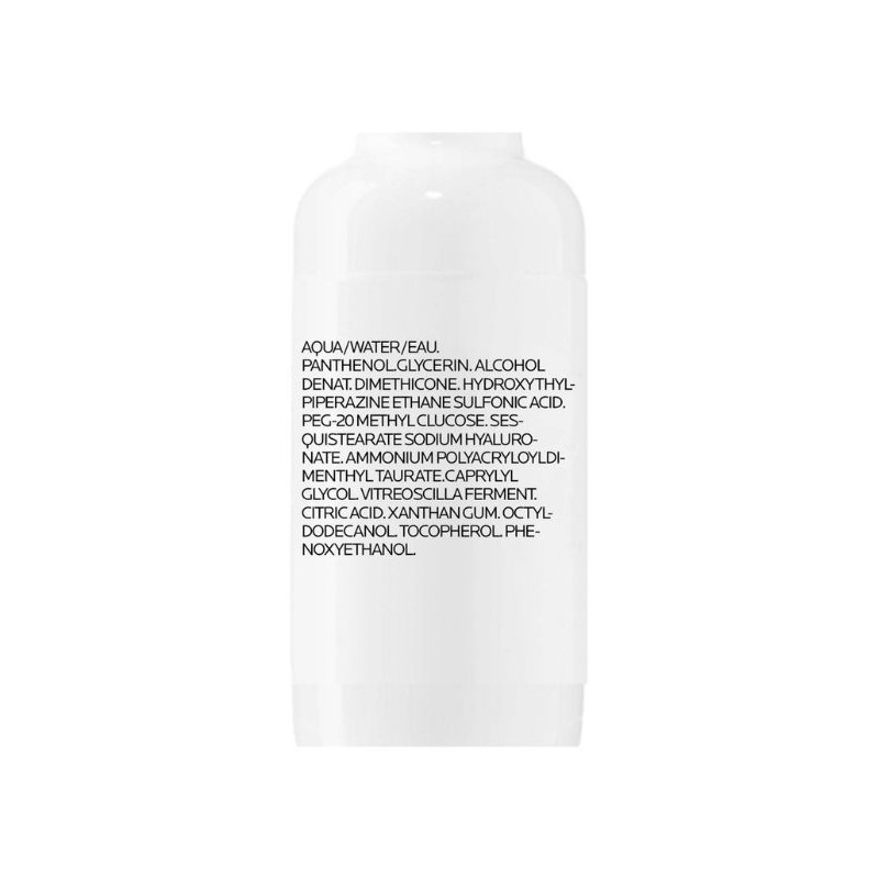 Aqua/Water/Eau, Panthenol, Glycerin, Alcohol Denat., Dimethicone, Hydroxyethylpiperazine Ethane Sulfonic Acid, PEG-20 Methyl Glucose Sesquistearate, Sodium Hyaluronate, Ammonium Polyacryloyldimethyl Taurate, Caprylyl Glycol, Vitreoscilla Ferment, Citric Acid, Xanthan Gum, Octyldodecanol, Tocopherol, Phenoxyethanol.