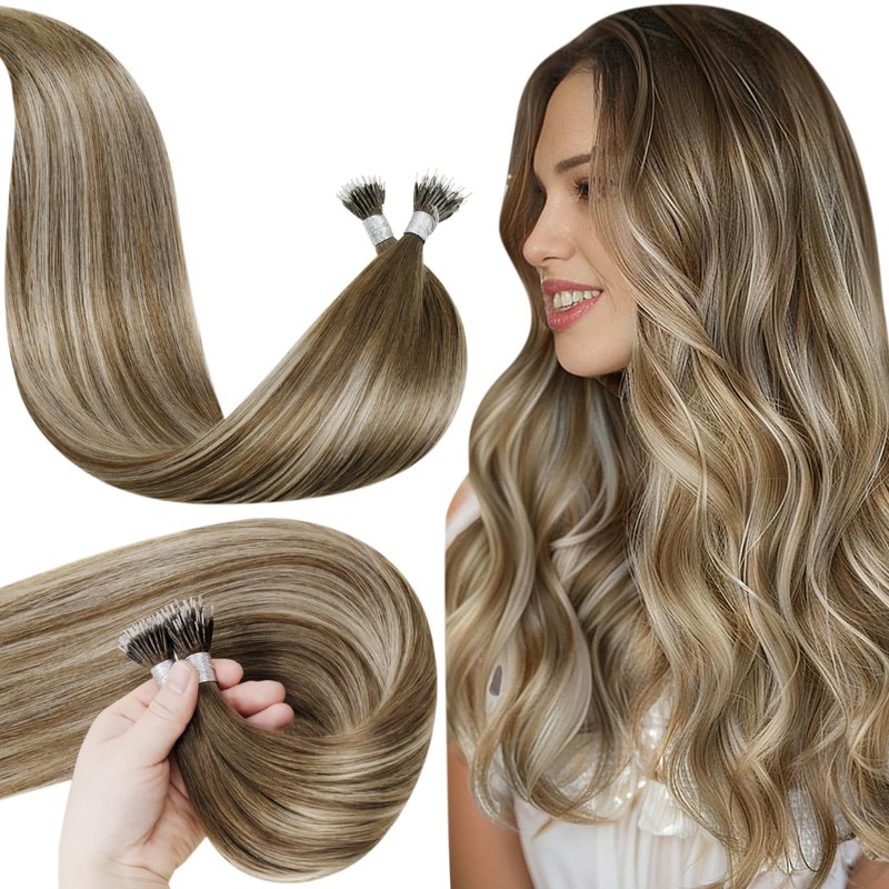 LaaVoo Nano Hair Extensions Real Human Hair - Nano Beads & Nano Ring Invisible Extensions - Remy Straight Balayage Dark Brown to Light Brown & Platinum Blonde Hair Extensions 50s 50g 14 Inch #3/8/24