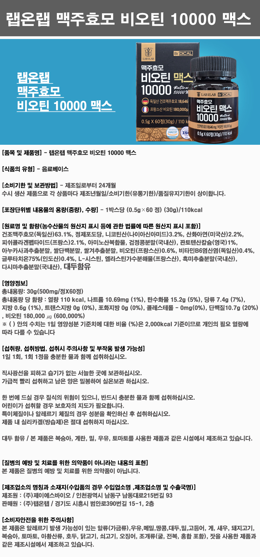 랩온랩 맥주효모 비오틴 10000 맥스 3박스 ()