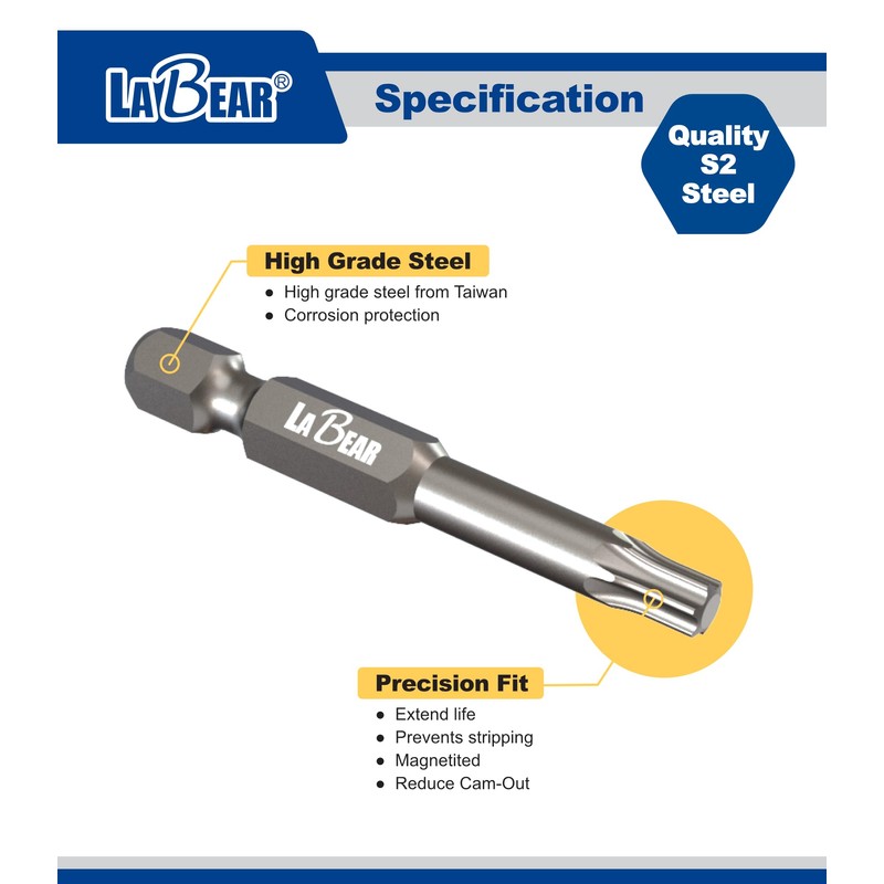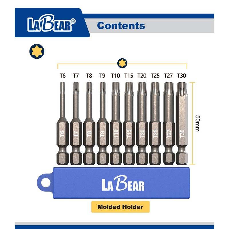 LABEAR - TORX Bit Set, 10-Piece 6 Point TORX Screwdriver Bit Set. S2 Steel, 2" Star Bit Set (T6, T7, T8, T9, T10, T15, T20, T25, T27, T30)