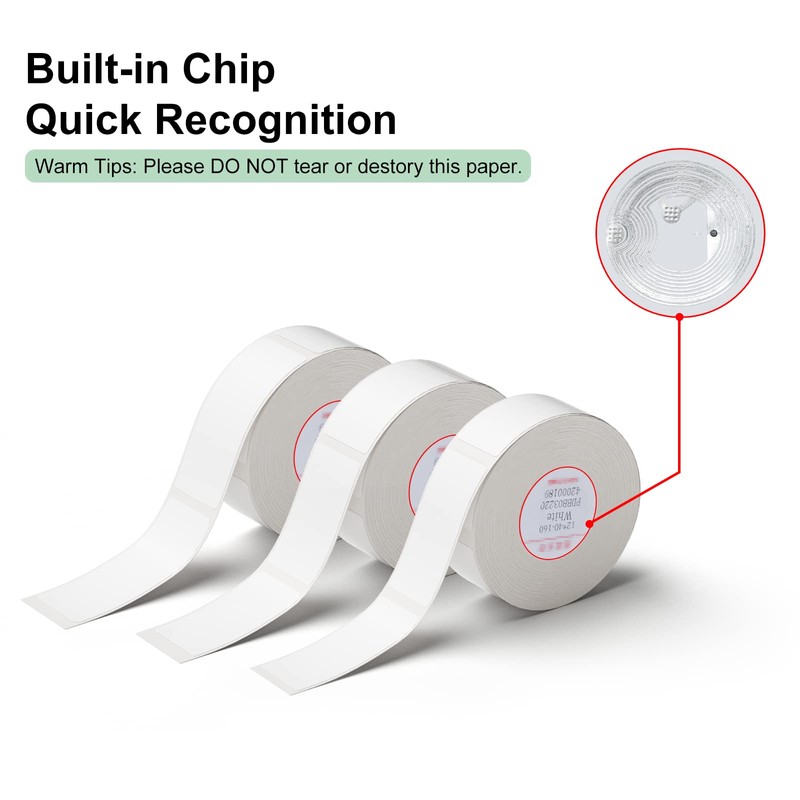 - Auto Identification Labels: Label tapes with smart identification chips can be automatically identified by D11/D110 label printers without manual search, easy to use and save time. NOTE: The sticker on the side of the roll contains the print sensor chip. Please do not tear or destroy the sticker, otherwise it will affect the printing effect.