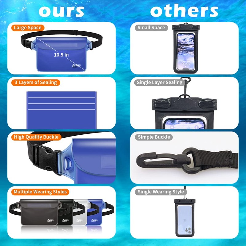 - đăBeach EssentialăLabeol waterproof phone pouch has 3 layers of sealing buttons and top with folded design. Fully protect your valuables from getting wet. Waterproof pouch with stylish design, provides practicality while giving you a stylish style. Perfect for beach and water activities, free your hands and enjoy yourself to the fullest!