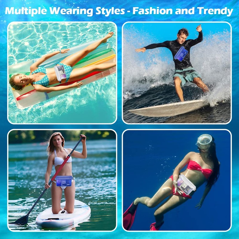 - đăBeach AccessoriesăThe waterproof pouch able to meet the needs of beach and water sports. For example beach activities, swimming, kayaking, boating, snorkeling, sailing, rafting, water slides, surfing and other water activities. Put your valuables in the pouch, don't worry about them getting wet.