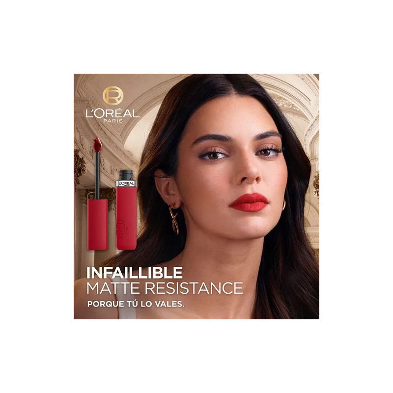 Labial Líquido Infaillible Le Matte Resistance de L'oréal Paris ofrece un acabado mate de larga duración, resistiendo hasta 16 horas. Su fórmula con pigmentos puros proporciona un color intenso en una sola aplicación, manteniendo la hidratación sin causar resequedad.