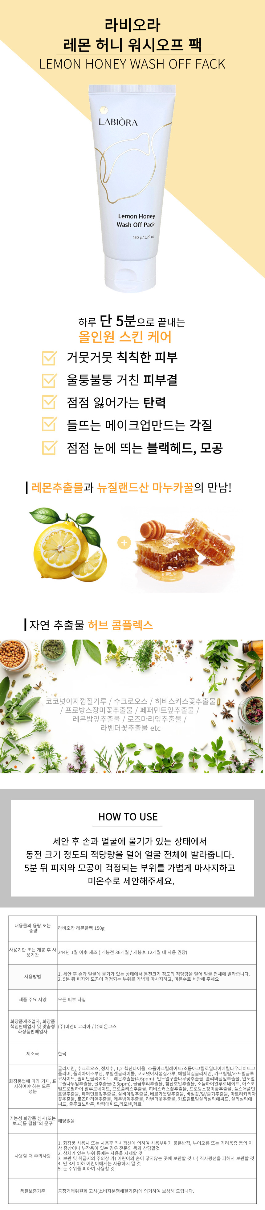 Labiora Lemon Honey Pack Lemon Honey Brightening Wash-Off Pore Pack Bae Jong-ok 150g 1 pack / 라비오라 레몬꿀팩 레몬 허니 브라이트닝 워시오프 모공 팩 배종옥 150g 1개