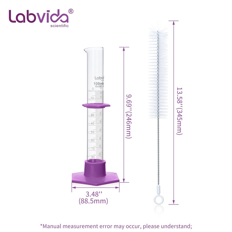 Labvida Measuring Cylinder Set, 100ml Borosilicate Glass Cylinders with Plastic Hex Base and Brush, Class B (4 Pcs), LVE004