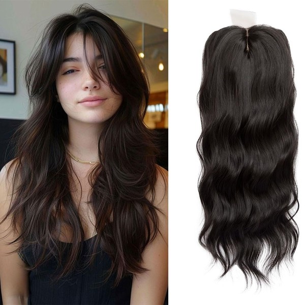 Lace Front Hair Body Wavy Topper Big Base Cover Thinning Hair White Clip in Hair Toppers for Women Fiber Wiglets with Fringe (Brown Black)