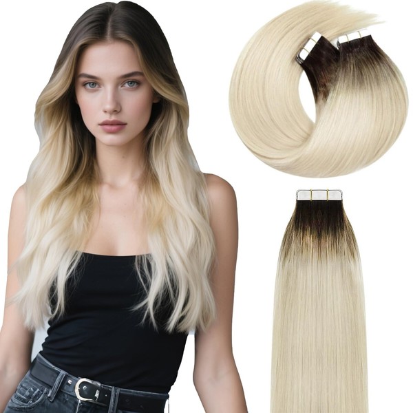 Lacer Hair 14 Inch Tape In Hair Extensions Human Hair Platinum Blonde With Lightest Brown Roots Hair Extensions Tape In Invisible Seamless Human Hair 50G 20Pcs
