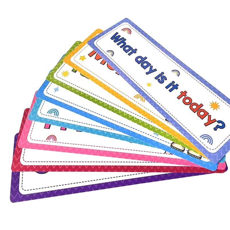 Specifications:Quantity: 8 Pieces Cards of "Days of the Week".Material: 250g coated paper, double sided high-quality film.Card Size: 10.5" X 3.46" / 26.7 X 8.8 CM.Package: Plastic bag.Notice:Colors may vary slightly due to different screens.Manual measurement, please allow slight size error.