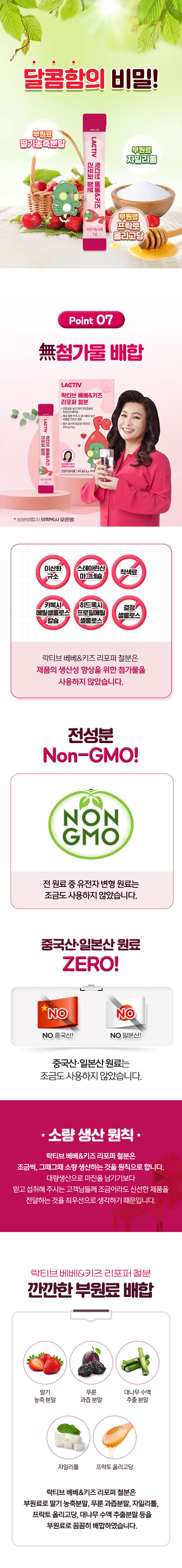 - Main Ingredients/Content (Ingredient Origin): Mixed preparation (corn starch, ferrous pyrophosphate, sunflower lecithin), vitamin C, fructooligosaccharides, xylitol, isomalt, strawberry flavor powder, strawberry concentrate powder, mixed preparation (dextrin, lactose, synthetic flavor, pectin, propylene glycol), bamboo sap extract powder, prune juice powder, enzyme-treated stevia