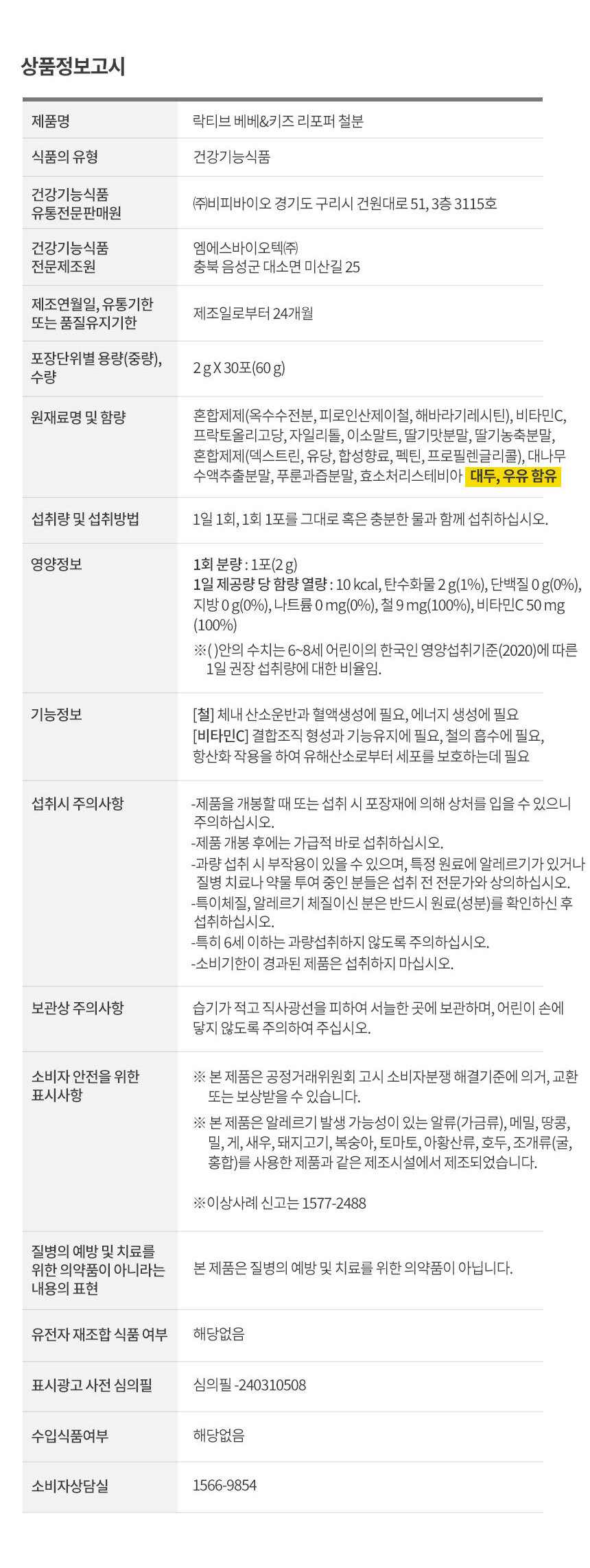| Main Ingredients | Corn starch, ferrous pyrophosphate, vitamin C, fructooligosaccharides, etc. |