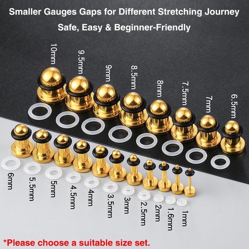 - Gauges Size: The current selection 4 pairs Gold color, size from 8.5mm to 10mm in 0.5mm increments, ensuring a smooth and gradual ear stretching experience, especially for newcomer to stretch ears.